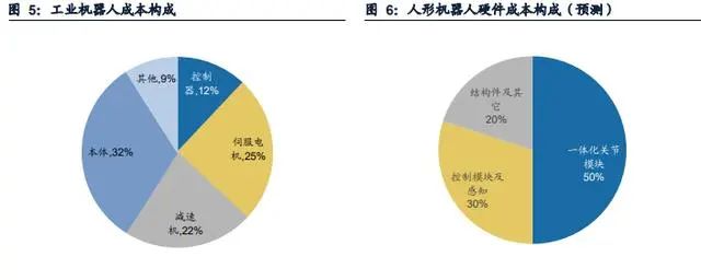 以人形机器人为代表的AI机器人相较工业机器人结构更为复杂,运动模块的成本相应更高。以特斯拉的人形机器人Optimus为例,其运动模块和部分感知模块被整合为一体化关节,这部分成本占比高达整机的50%。基于此,广发证券分析师代川及华泰证券分析师倪正洋均看好一体化关节投资价值。